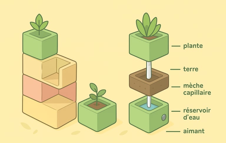 💧 Grâce à un système d’arrosage intégré, vos plantes restent vertes sans effort pendant plusieurs jours.